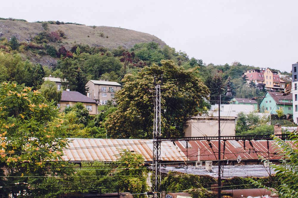 Une voie ferrée avec un environnement urbain à Prague, entourée de verdure