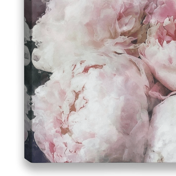 Tableau impressionniste dans des tons doux de rose, lilas et vert avec des pivoines et du souffle de bébé.