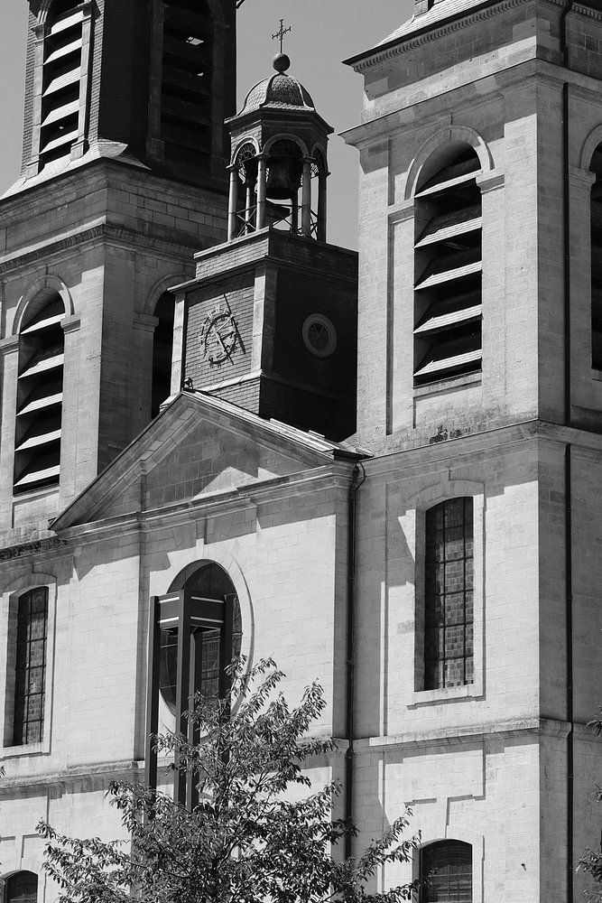 Vue de la Place d'Armes et de l'église St Charles à Sedan, dans le département des Ardennes du Nord de la France. Photo de voyage en noir et blanc de l'été dans une ville française typique, avec des cafés autour de la place principale.