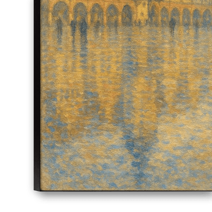 Cette scène transforme une place ordinaire en quelque chose d'intemporel. La pluie devient un peintre d'ambiance ; chaque reflet élargit le monde au lieu de le répéter. Les couleurs - jaunes beurre, bleus crépusculaires et gris sourds - créent une atmosphère de sérénité et de nostalgie, comme si la mémoire elle-même se déployait sur la scène.