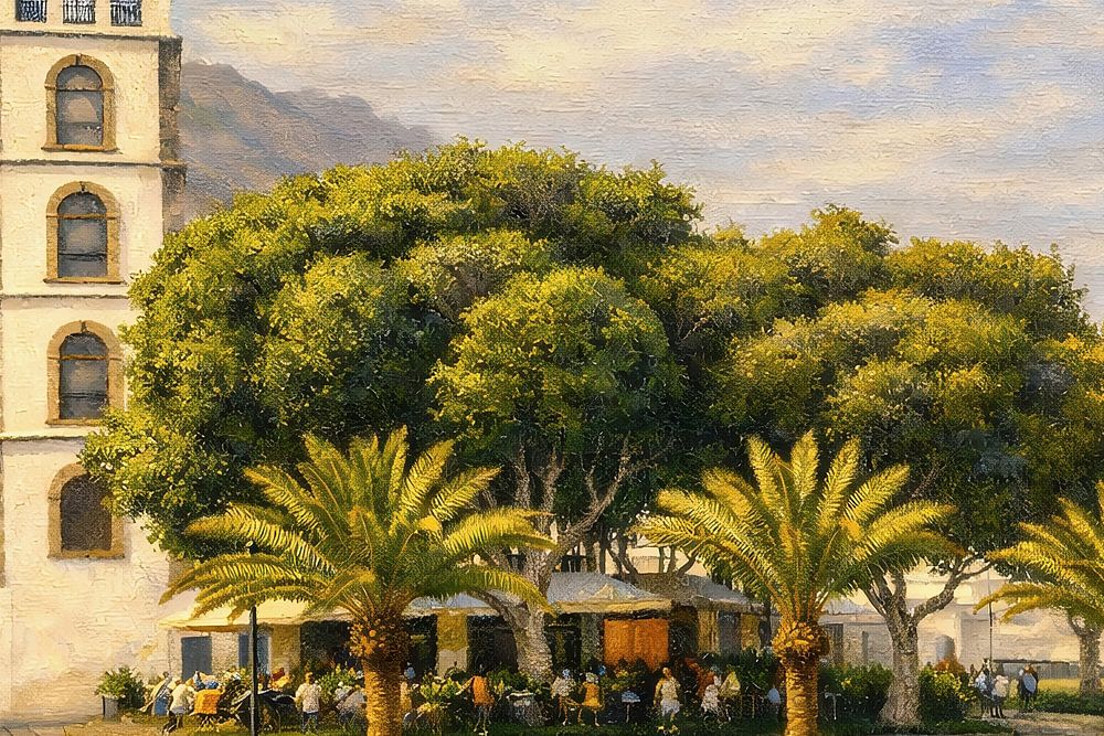Ce tableau impressionniste représentant la Plaza de La Libertad à Garachico, sur l'île de Tenerife, rend l'atmosphère paisible de la place à l'aide de tons chauds. À gauche se dresse le clocher blanc de l'Iglesia de Santa Ana, tandis qu'au centre on aperçoit des palmiers et une terrasse. Des arbres luxuriants et des palmiers projettent…