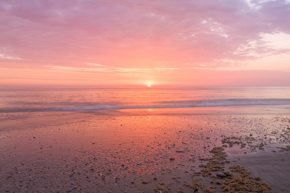 Quel beau coucher de soleil à Noordwijk Aan Zee. Les nuages offraient de belles couleurs et le soleil était juste au-dessus de l'horizon. Il s'agit d'une prise de vue de 1,3 seconde qui rend la mer un peu plus calme et donne une image apaisante. J'aime aussi les motifs des algues au premier plan qui s'harmonisent avec le ciel.