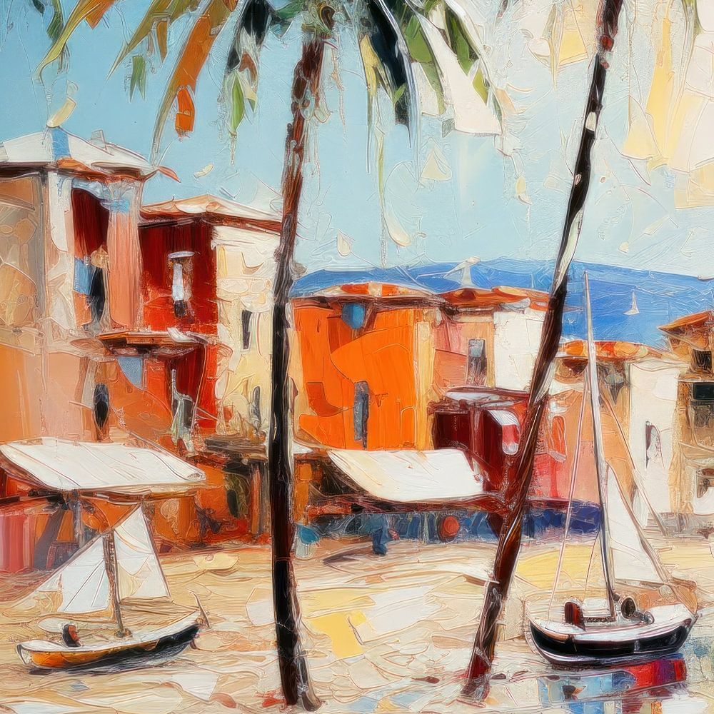 Motif numérique d'une plage avec des palmiers et des maisons, qui ressemble à une peinture à l'huile.