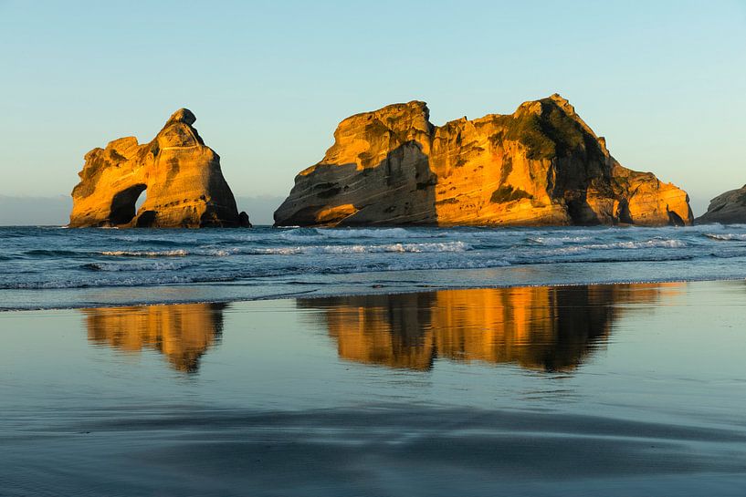 Plage de Wharariki au coucher du soleil, Golden Bay, île du Sud, Nouvelle-Zélande,