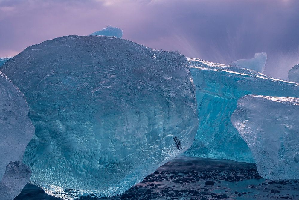Une photo de Diamond Beach près de Jökulsárlón, en Islande. Les morceaux de glace se sont détachés du glacier Vatnajökull et ont été projetés par le vent et les marées sur la plage noire pour fondre très lentement.