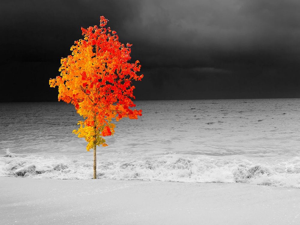 Sur une plage isolée se trouve un arbre solitaire qui défie l'ordinaire. Cet arbre dégage comme aucun autre une douce lueur éthérée et projette une lumière calme sur le sable et les vagues qui clapotent doucement.