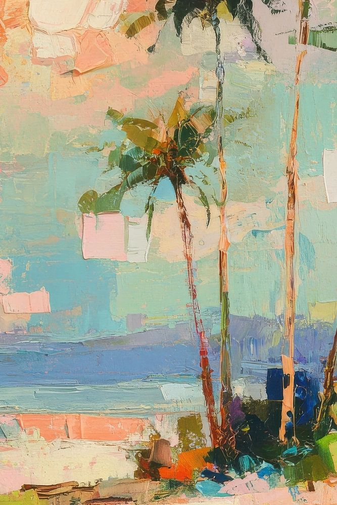 Un paysage de plage tropicale avec des palmiers, peint dans des tons pastels harmonieux. Le ciel présente de douces nuances de rose et de turquoise, réalisées avec une technique de spatule et des coups de pinceau détaillés qui confèrent profondeur et structure. La composition évoque le calme et une ambiance estivale détendue sur une île exotique. Des couleurs vives et des dégradés soignés créent une atmosphère tropicale joyeuse et capturent la lumière et la beauté de la nature.