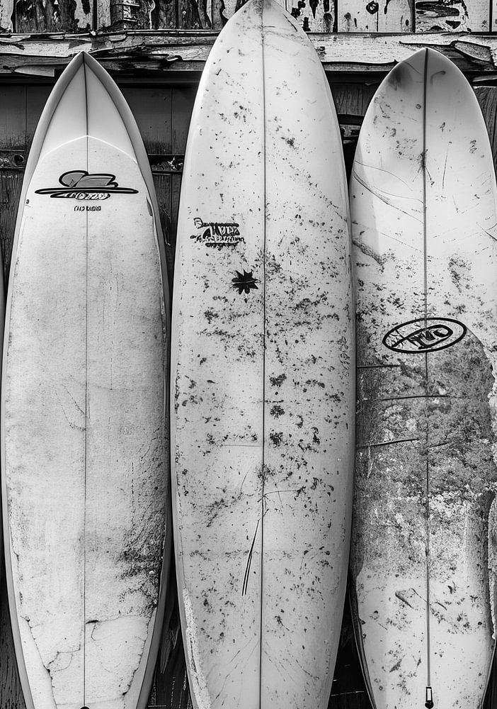 Rangée de planches de surf usagées aux couleurs pastel sur un mur défraîchi.