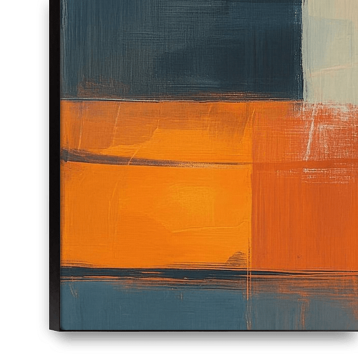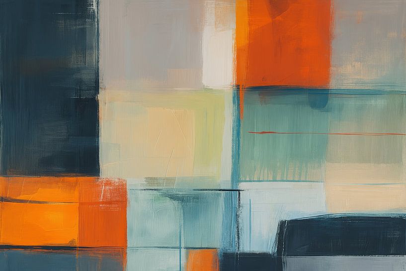 Des rectangles superposés avec des accents orange chauds et des zones bleu-vert profondes créent une composition vibrante et moderne. Les bords doux et la texture subtile du pinceau créent un mouvement, tandis que les tons calmes de gris équilibrent l'ensemble. Les formes géométriques se chevauchent et se déplacent, créant un rythme et…