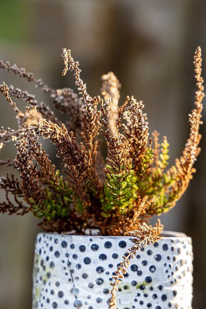 Ce charmant tableau représente une plante automnale placée dans un pot de fleurs à pois artistiquement conçu, sur une table en bois rustique. Les tons chauds et la lumière douce confèrent à l'image une atmosphère confortable et accueillante. Parfait pour les amateurs de plantes et d'éléments décoratifs qui apprécient la beauté de la nature et l'art du jardinage. Ce tableau apporte un peu de nature dans chaque foyer et ajoute une touche spéciale.