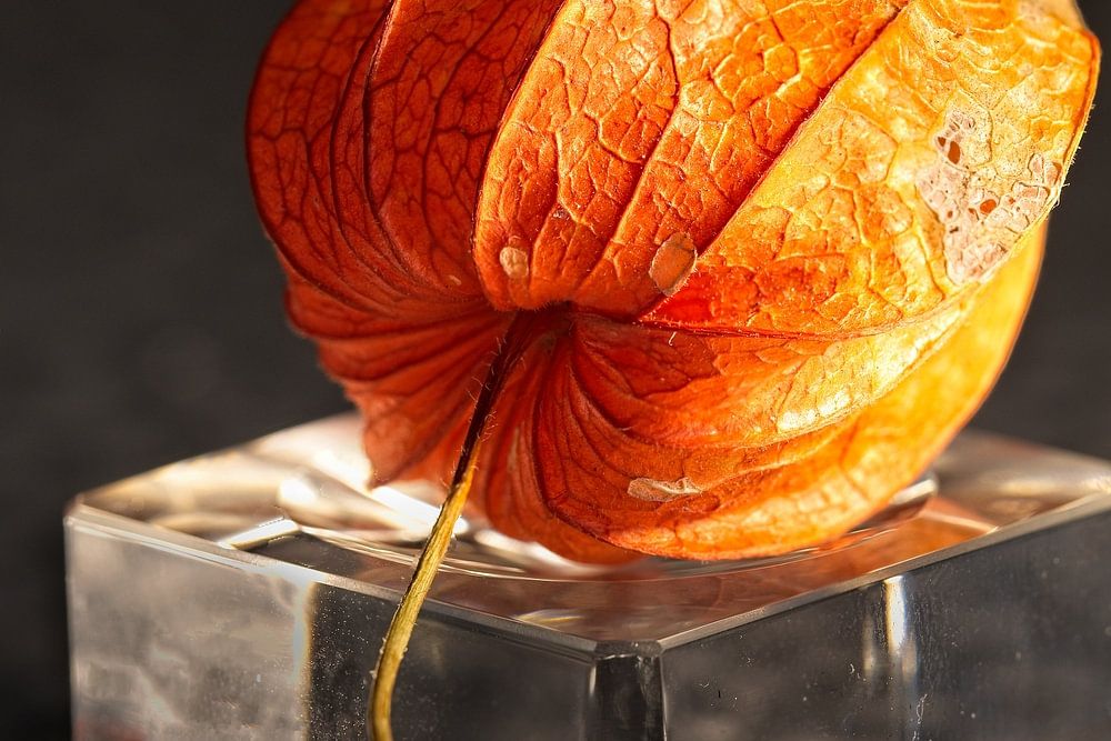 Photo macro à mise au point superposée d'une plante lanterne orange