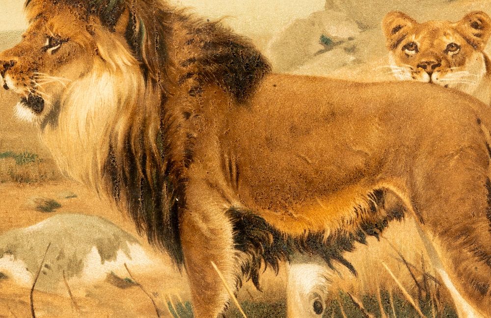 Acheter ce illustration Plaque d'écolier ancienne en couleur Lion d'Afrique par Studio Wunderkammer sur toile, aluminium, ArtFrame ou photographie (encadrée), impression d'art en haute qualité et tout format.