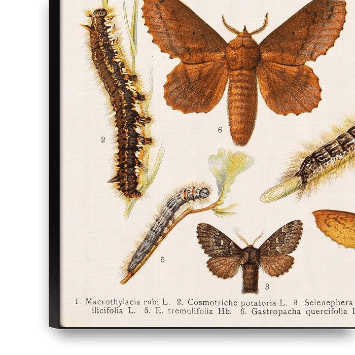 Gravure ancienne datant d'environ 1910 représentant une collection de papillons et leurs chenilles. Les noms latins sont mentionnés sous les images. Nous incluons le pinson des roseaux.