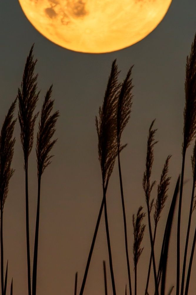 De hautes herbes se dressent en douces silhouettes contre la lune dorée et radieuse qui illumine majestueusement le ciel nocturne. Sa lumière chaude confère à la scène un éclat magique, tandis que le ciel scintille dans des nuances profondes de bleu et de gris. Un moment de calme où la nature et les corps célestes se fondent en parfaite harmonie.