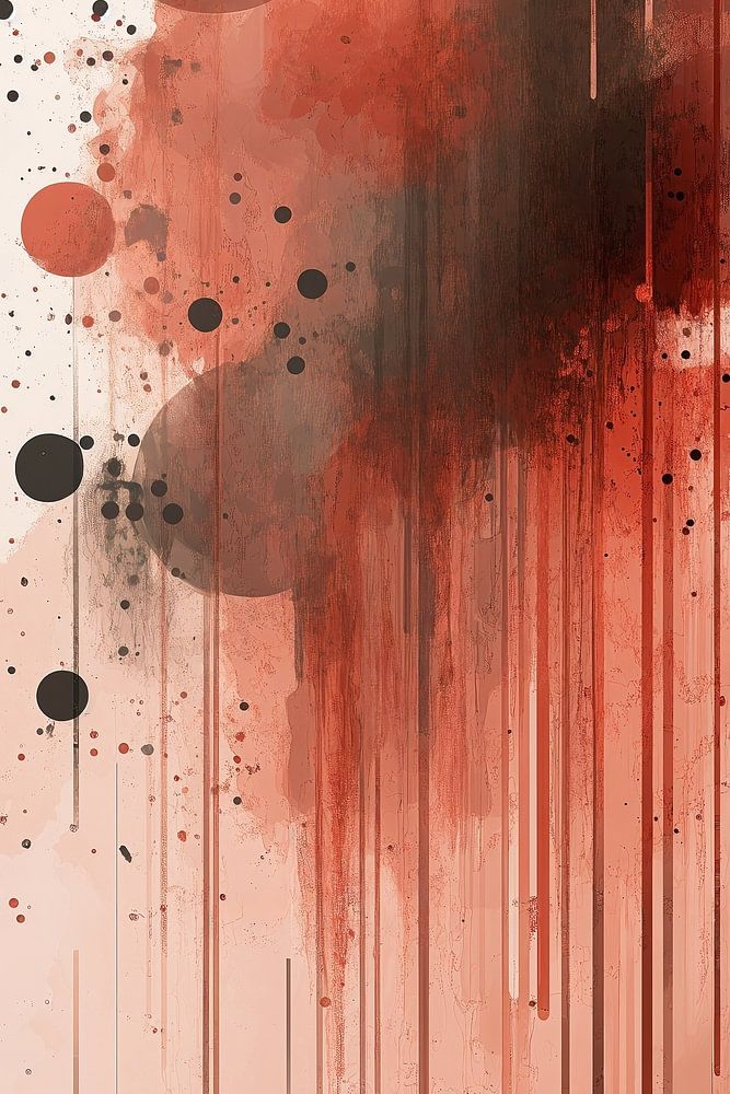 Cette œuvre abstraite futuriste évoque une image de pluie cosmique ou de nébuleuse numérique. Les tons roses et rouges créent une atmosphère de rêve, tandis que les accents noirs ajoutent de la profondeur. Les éléments circulaires flottent comme des planètes ou des points de données, et les lignes verticales suggèrent un mouvement. Les éclaboussures et les taches ajoutent un élément organique à la composition géométrique. L’œuvre oscille entre chaos et ordre et suggère une fusion de technologie et de nature. Cette illustration invite à réfléchir sur le lien entre le cosmique et le numérique, et évoque l'émerveillement sur la complexité de notre univers à l'ère numérique.