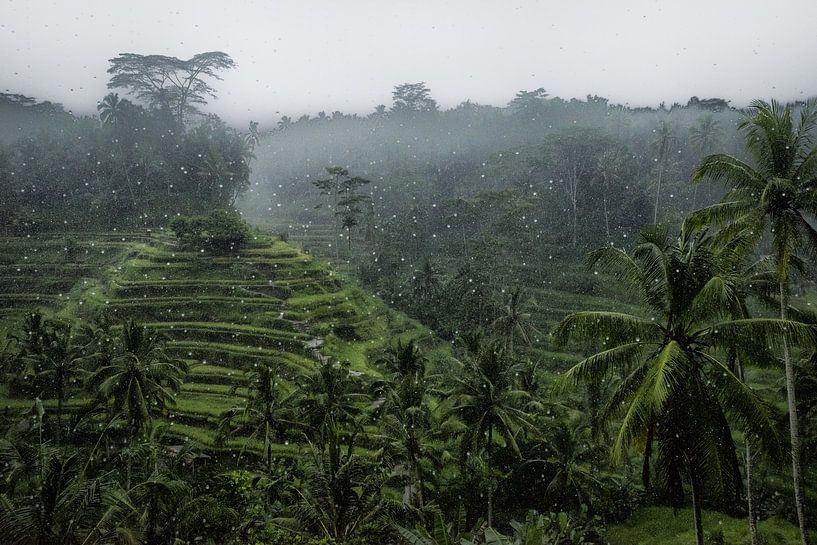 La célèbre rizière de Tegalang à Bali près d'Ubud est fascinante par tous les temps. Pendant cette pluie tropicale, par exemple, la brume et les grosses gouttes de pluie lui confèrent une atmosphère mystérieuse.