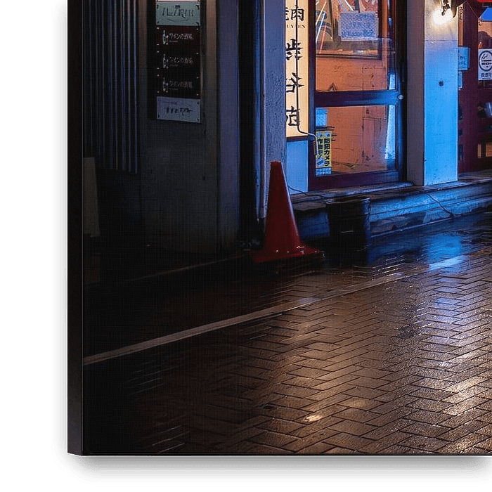 Cette photo capture une soirée pluvieuse à Tokyo, où les rues étroites sont éclairées par des enseignes au néon et des rangées de lanternes rouges. La surface mouillée de la rue reflète la lumière et multiplie les couleurs, donnant à l'image un aspect presque pictural. Le rouge, le bleu et le jaune se mélangent pour former le rythme de…