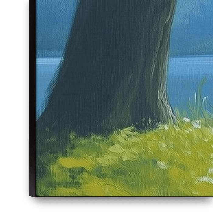 Rond het meer kaderen hoge bomen het beeld; dikke stammen in de voorgrond en een bladerdak dat het licht filtert. Dit is een bomen schilderij in klassieke zin, maar dan gemoderniseerd: de stammen zijn stevig, bijna gebeeldhouwd, terwijl de bladeren zijn opgebouwd uit dunne, frisse vlekken en kleine stipjes verf — een techniek die tegelijk realistisch en licht abstract voelt. In de voorgrond zacht gras en een uitgesproken rots geven tactiele ankerpunten: je ziet hoe de schilder laagjes verf gebruikte om die richting en textuur te benadrukken, kleine kwaststreken voor het gras, bredere overgangen voor het water.