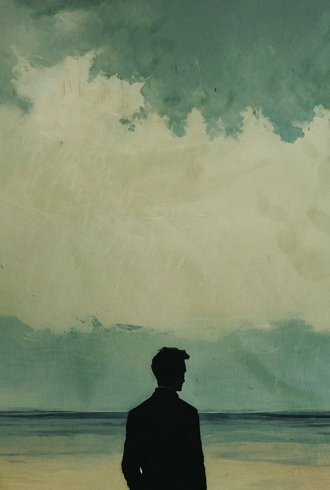 Mélange d'I.A. et d'art numérique, cette œuvre montre la silhouette d'un homme regardant un lac.