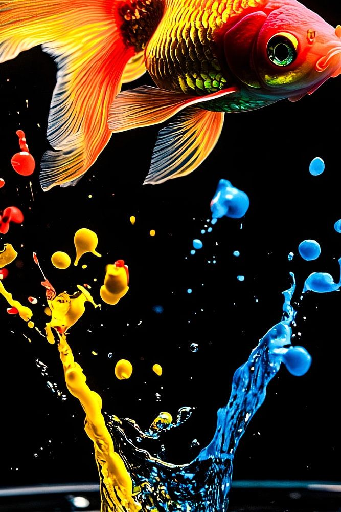 Une impression d'art unique d'un poisson rouge sautant dynamiquement hors d'un bassin d'eau colorée. Parfait pour les amateurs de couleurs vives et de styles artistiques créatifs. Cette composition saisissante associe la beauté naturelle à des éléments abstraits et surréalistes, attirant ainsi le regard dans n'importe quel intérieur. Ajoutez de la couleur et de l'énergie à votre espace avec ce design unique qui respire le mouvement et la vie. Idéal pour les intérieurs modernes ou éclectiques.