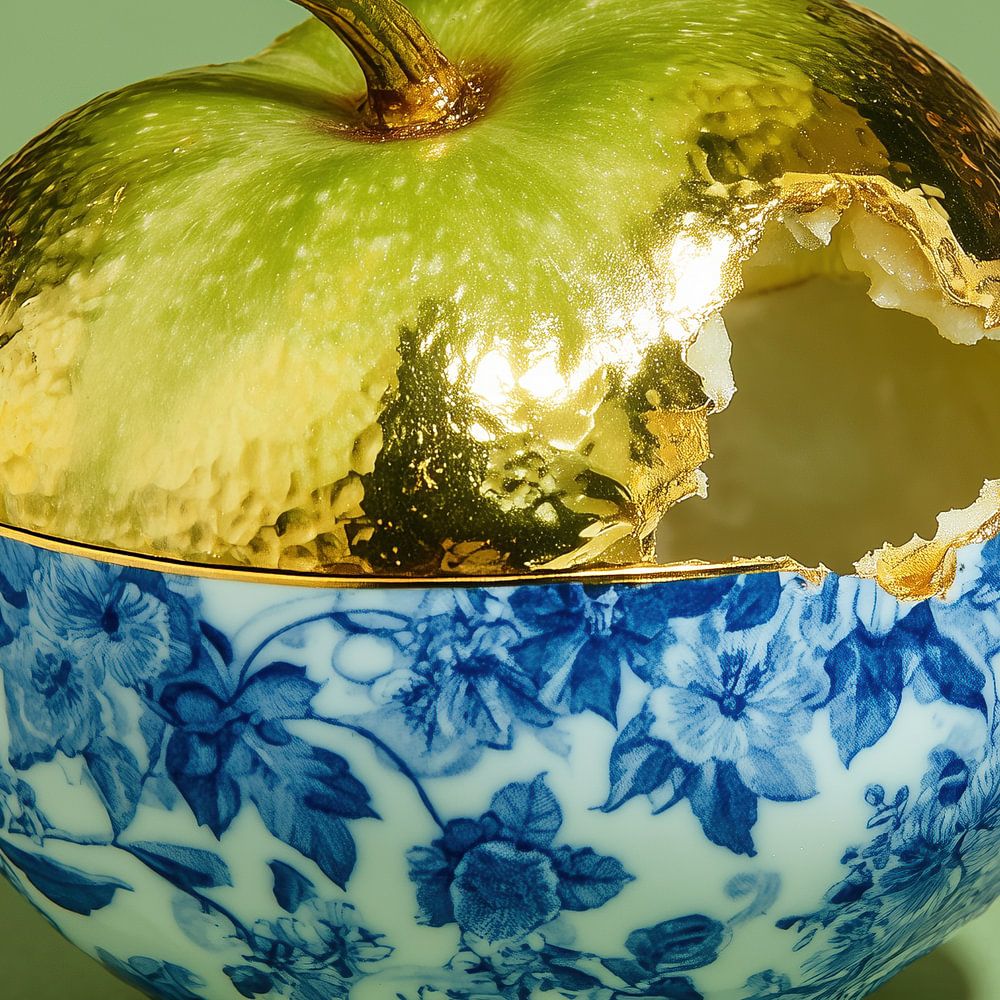 Une pomme moitié or et moitié porcelaine bleue de Delft : un jeu surréaliste entre l'impermanence et la beauté éternelle.