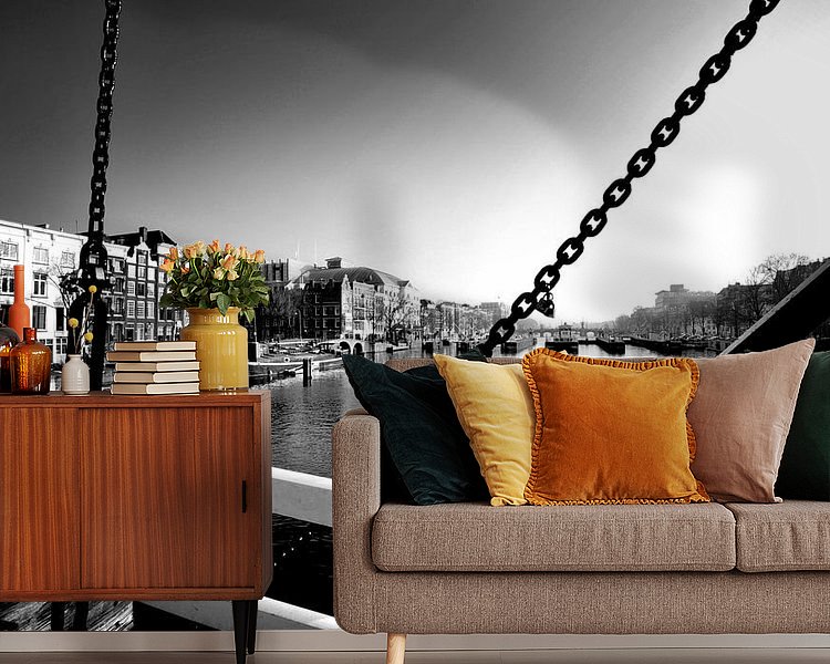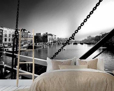 Pont maigre d'Amsterdam, amstel, canal, façades de canal, chaîne, centre-ville, vieille ville, architecture classique, photo de rue, photographie de rue, photo en noir et blanc, photographie en noir et blanc, image horizontale, amsterdam, urbain, Rob Blok Photo