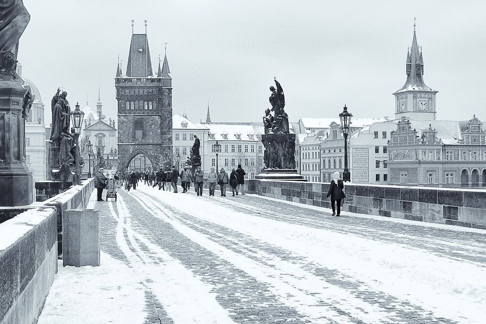 Noir et blanc atmosphère de photographie du pont Charles en hiver sur une journée froide. Le pont est un groupe de touristes.
