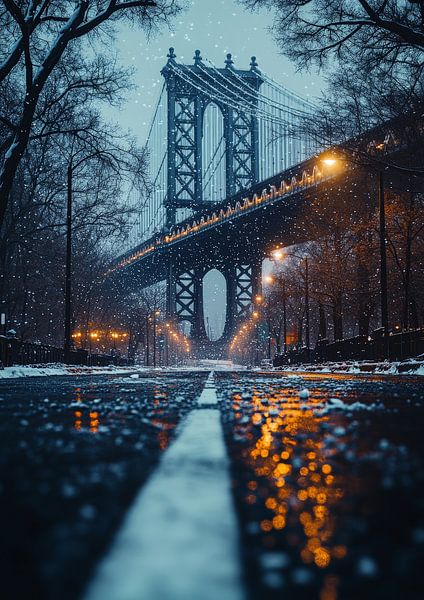 Une prise de vue spectaculaire en contre-plongée du pont de Manhattan à DUMBO, Brooklyn, New York, pendant une chute de neige. La chaussée humide au premier plan reflète la lueur chaleureuse des lampadaires et des lumières du pont, créant un effet bokeh. Des arbres dénudés bordent les côtés de la route, saupoudrés de neige. Le pont…