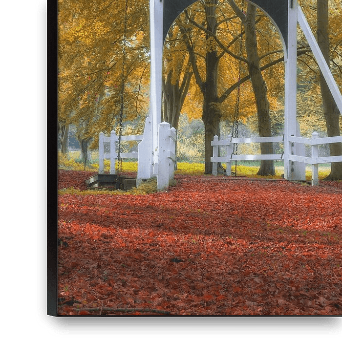 Un pont de bois blanc sous une voûte d'or et de cuivre. La douce brume du matin illumine les couleurs chaudes de l'automne, tandis que le chemin des feuilles vous invite à vous arrêter un instant.
