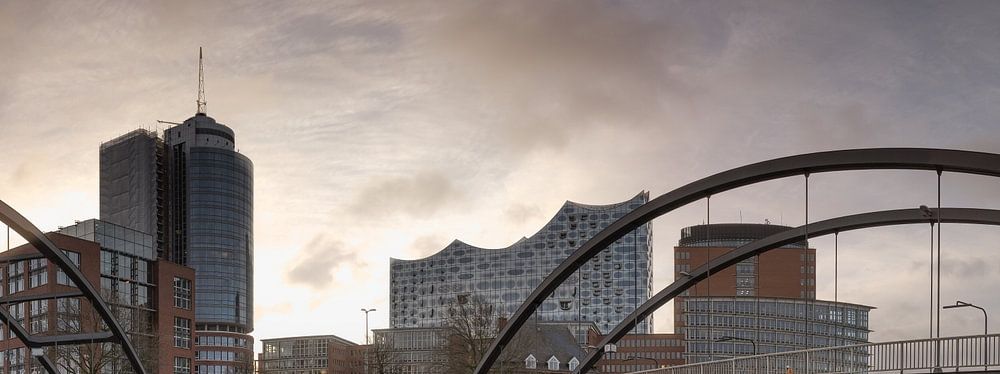 Cette photo montre un pont remarquable dans la Speicherstadt de Hambourg avec l'Elbphilharmonie en arrière-plan, encadré de bâtiments modernes et historiques. L'ambiance lumineuse douce et la surface réfléchissante de l'eau confèrent à la scène une élégance urbaine. Parfaitement adapté à des thèmes tels que l'urbanisme, les voyages, l'architecture et la culture. L'image transmet un sentiment de connexion, d'innovation et le charme particulier de la ville hanséatique de Hambourg.