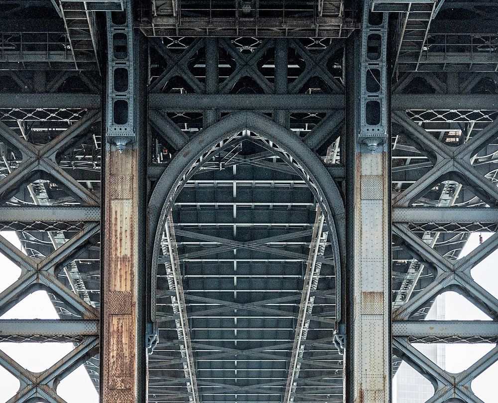 La disposition symétrique des poutres en acier et les lignes qui s'étendent au loin créent un sentiment de profondeur et d'infini. La photographie capture le jeu complexe d'ombre et de lumière créé par la structure massive, renforçant ainsi l'impression de force et de stabilité qui se dégage du pont.