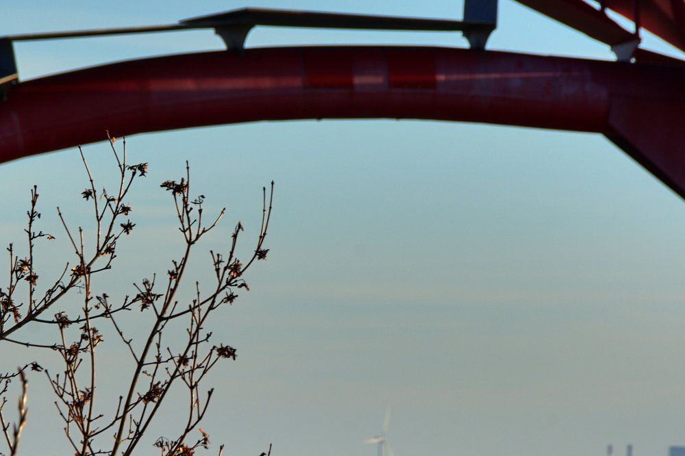 Pont dragon à Herten qui mène au terril de Hoheward, en arrière-plan la centrale électrique de Datteln 4