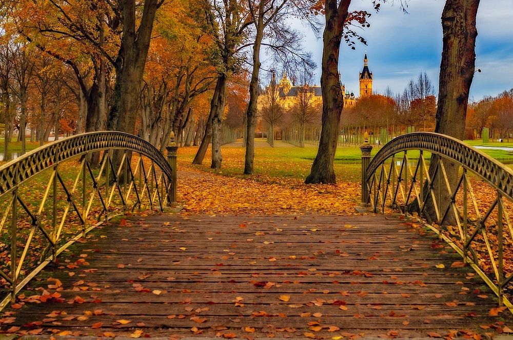 Un des nombreux ponts du Kreuzkanal dans les jardins du château de Schwerin. Le canal en croix dans le jardin du château de Schwerin est l'un des éléments d'aménagement les plus impressionnants du parc historique entourant le château de Schwerin. Il a été aménagé au 18e siècle dans le cadre du réaménagement baroque du jardin du château et reflète l'esprit de cette époque où la symétrie, la perspective et le lien entre l'architecture et la nature jouaient un rôle central.