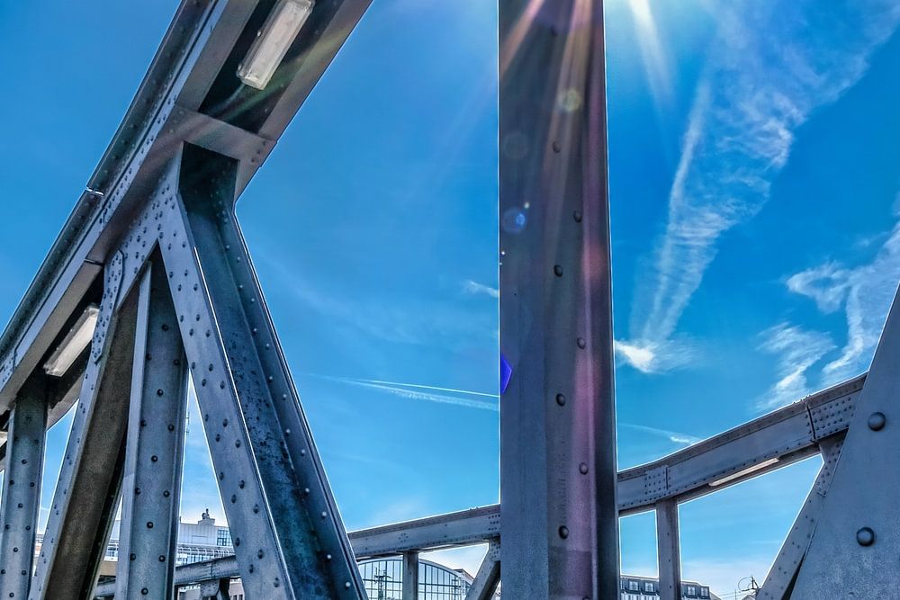 A propos de "Pont en acier et château d'eau sur fond de ciel bleu. Gare centrale de Darmstadt"