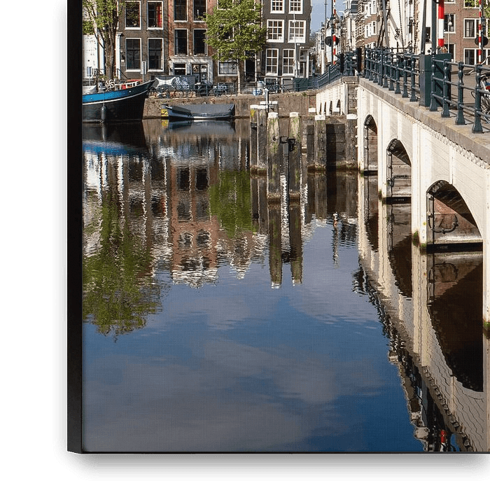 Cette œuvre montre le Pont Maigre à Amsterdam vu du côté du Théâtre Carré. L'eau sans rides de l'Amstel reflète les beaux contours du pont. Cette œuvre peut également être commandée en noir et blanc.