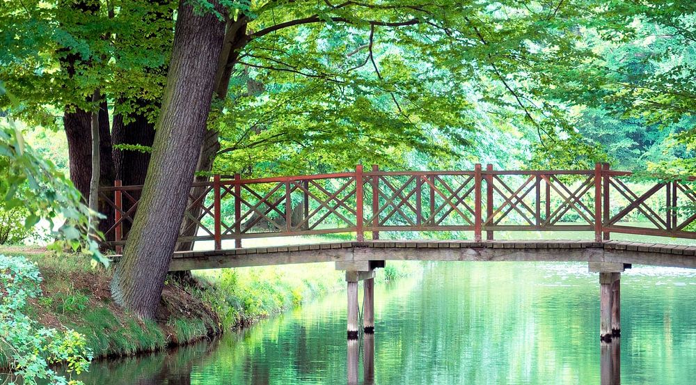 Un pont Hloz dans le parc qui se reflète dans l'eau de la rivière.