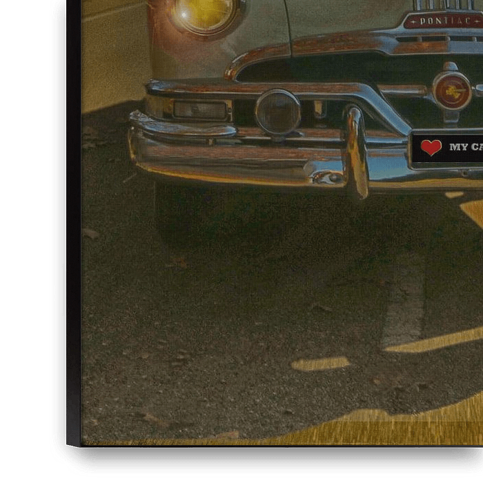 En route avec une voiture vintage, Pontiac Chieftain de 1952. La plaque d'immatriculation de la voiture est: I love ma voiture. La voiture entièrement restaurée est placé dans un paysage fictif, principalement dans les couleurs jaune or et vert.