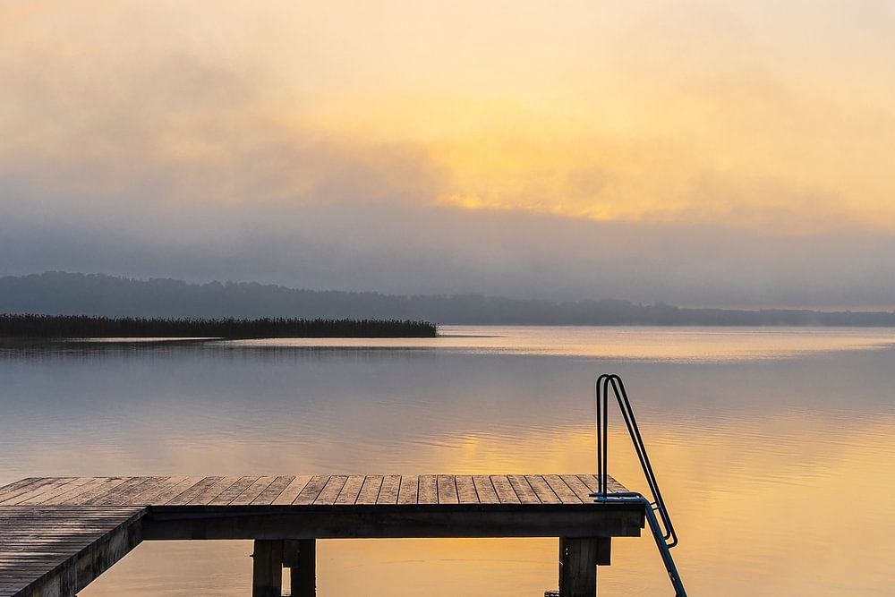 Ponton de baignade à Seedorf am Schaalsee au lever du soleil.