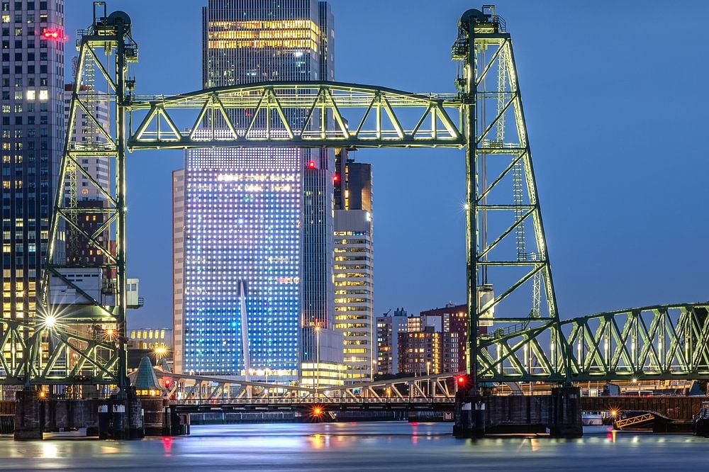 Vue du Kop van Zuid avec le Hef et le pont Erasmus