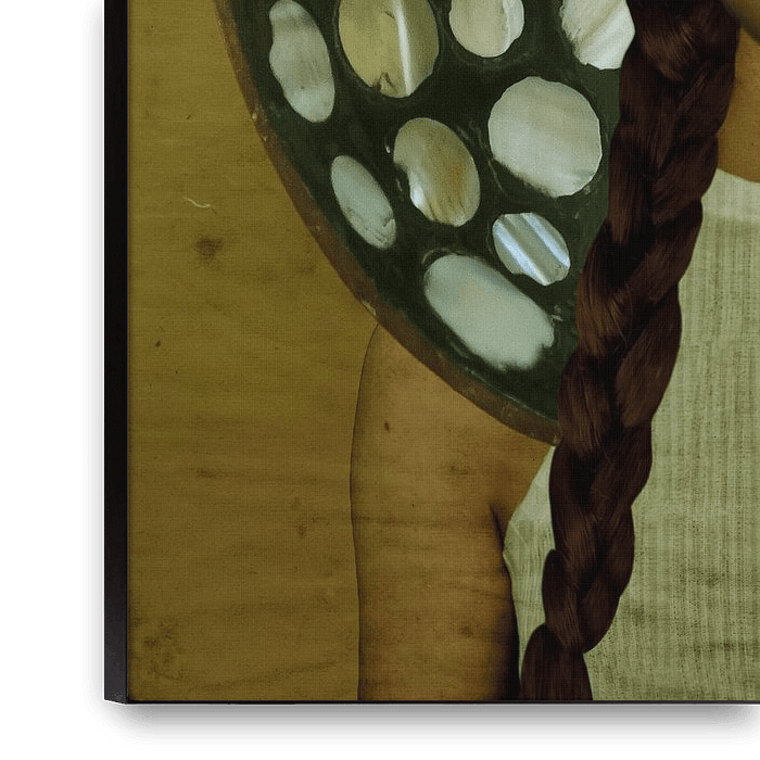 Popart Beauty, icône de mosaïque et de nacre sur fond de feuilles d'or. Elle est la muse d'un nouveau pop art, non pas comme une reproduction du passé, mais comme l'incarnation d'une idée intemporelle : la beauté en tant qu'expression, en tant que pouvoir, en tant qu'histoire. Chaque fragment semble porter un souvenir, une histoire…