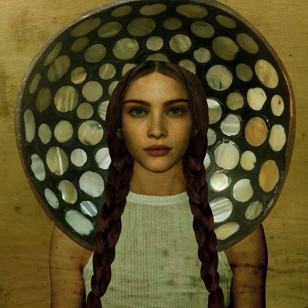 Popart Beauty, icône de mosaïque et de nacre sur fond de feuilles d'or. Elle est la muse d'un nouveau pop art, non pas comme une reproduction du passé, mais comme l'incarnation d'une idée intemporelle : la beauté en tant qu'expression, en tant que pouvoir, en tant qu'histoire. Chaque fragment semble porter un souvenir, une histoire en couleur et en brillance. Ses cheveux sont un clin d'œil aux années 1960, tressés en trois fines mèches, modernes mais imprégnés de nostalgie - comme un pont entre les époques. Elle porte un simple haut blanc, épuré mais sans fioritures. Son austérité met en valeur l'éclat de l'or, chaud comme un coucher de soleil. Le contraste entre la robe et le décor lui confère une sorte d'équilibre, à la fois discret et époustouflant. Icône du pouvoir féminin, de l'élégance contemporaine et de l'esprit libre du pop art, elle n'offre aucune explication, seulement de l'inspiration.