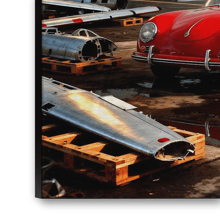 Cette pièce capture un moment d'harmonie entre l'ingéniosité humaine et la beauté du design. Au cœur de la composition se trouve la Porsche 356, icône intemporelle de l'artisanat automobile. Sa teinte rouge vif se détache audacieusement des tons sourds du ciel orageux et de l'éclat métallique des pièces d'avion qui l'entourent. La voiture est plus qu'une machine, c'est un symbole de passion, de précision et de recherche de la perfection.