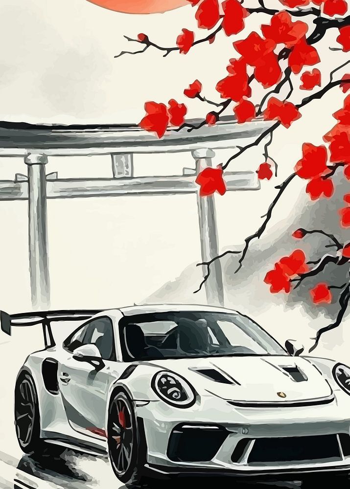 Porsche 911 GT3 RS Soleil rouge et porte Torii Paysage