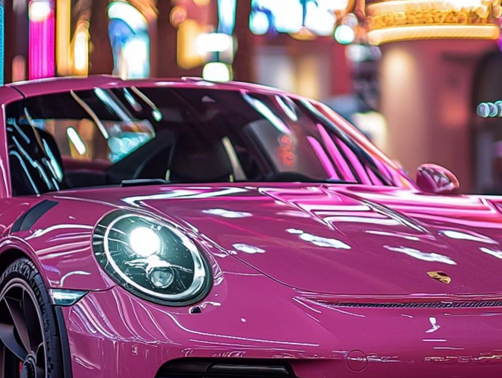 Une Porsche 911 rose vif brille sur le Strip de Las Vegas, entourée d'une mer de néons scintillants. Les reflets des panneaux publicitaires colorés dansent sur la carrosserie élégante. L'asphalte mouillé reflète le spectacle lumineux, tandis que l'énergie vibrante de la ville met en valeur le luxe et la vitesse de la Porsche.