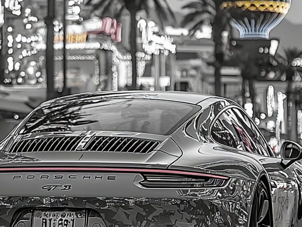 Cette plaque représente, dans des tons monochromes, une Porsche 911 GT3 sur le Strip de Las Vegas, entourée de néons lumineux. Les contrastes entre le noir, le blanc et le gris accentuent les lignes puissantes de la voiture, tandis que les néons reflètent le dynamisme de la ville. Cette scène évoque le luxe discret et puissant de la nuit.