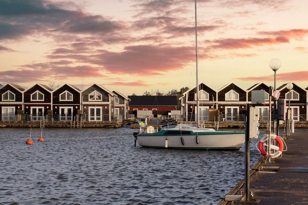 port, maisons de vacances en Suède sur l'eau, coucher de soleil Sunnana hamn