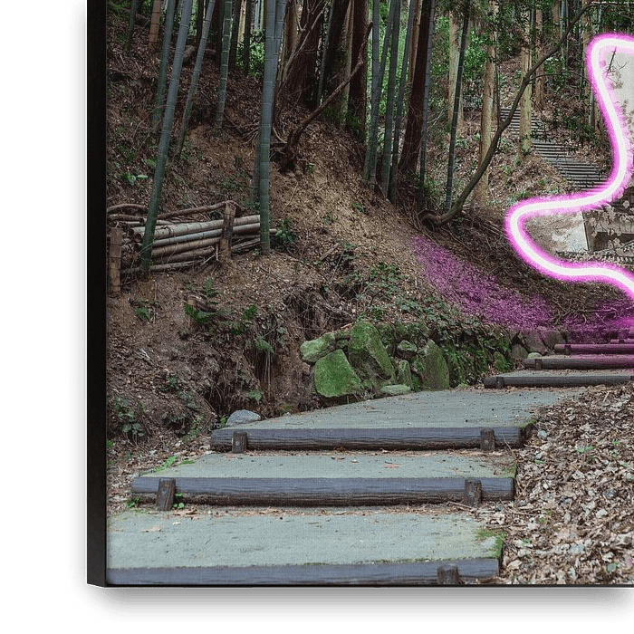 Suivez les escaliers qui mènent au portail en néon dans la forêt de bambous verts pour découvrir un monde de cerisiers roses en fleurs et de châteaux au Japon.