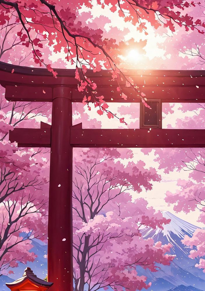 Sous la voûte éclatante des cerisiers en fleurs, un imposant torii cramoisi se dresse, des lanternes brillant doucement à sa base. Au-delà de son arche, la silhouette lointaine du mont Fuji veille sur le pays, baignée dans la lumière dorée du soleil couchant. Gate of Tranquility invite les voyageurs à entrer dans l'harmonie, là où la nature, l'esprit et la tradition convergent dans une beauté intemporelle.