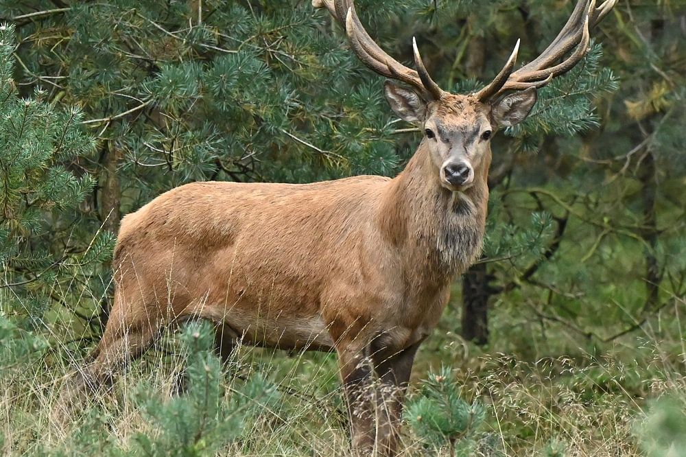 Ce cerf élaphe est sorti du fourré et a regardé curieusement une meute de biches avec 1 porteur de bois pendant la saison du rut au Hoge Veluwe.