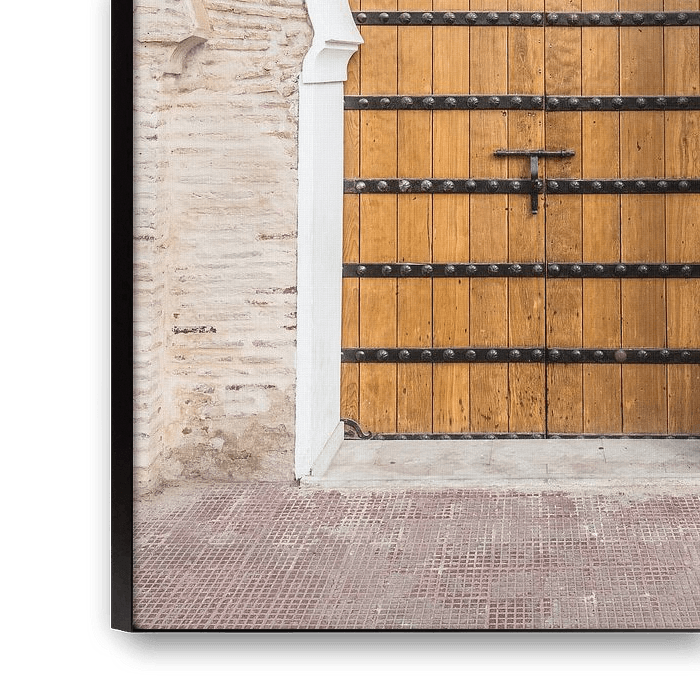 Cette photographie a été prise à Marrakech, au Maroc. Au premier plan se trouve une porte en bois brun, joliment encastrée dans une façade en briques. La porte est arrondie dans sa partie supérieure, suivant la forme de l'arc qui la surplombe. L'arc est fait des mêmes briques que le reste du mur et constitue un élément distinct et reconnaissable dans de nombreux bâtiments traditionnels de Marrakech. La combinaison de la porte ronde et de l'arc en briques lui confère un aspect calme et équilibré.